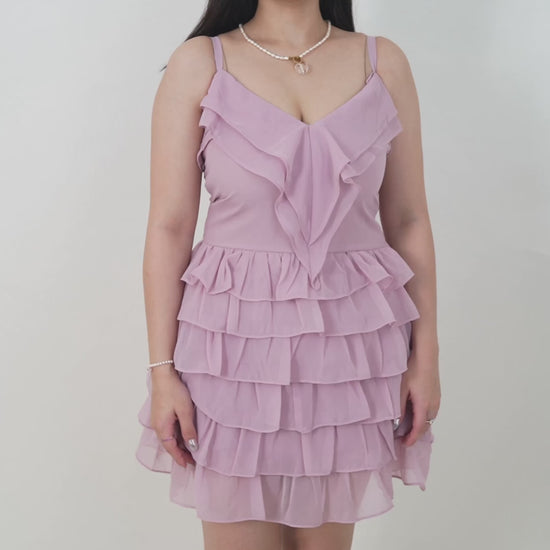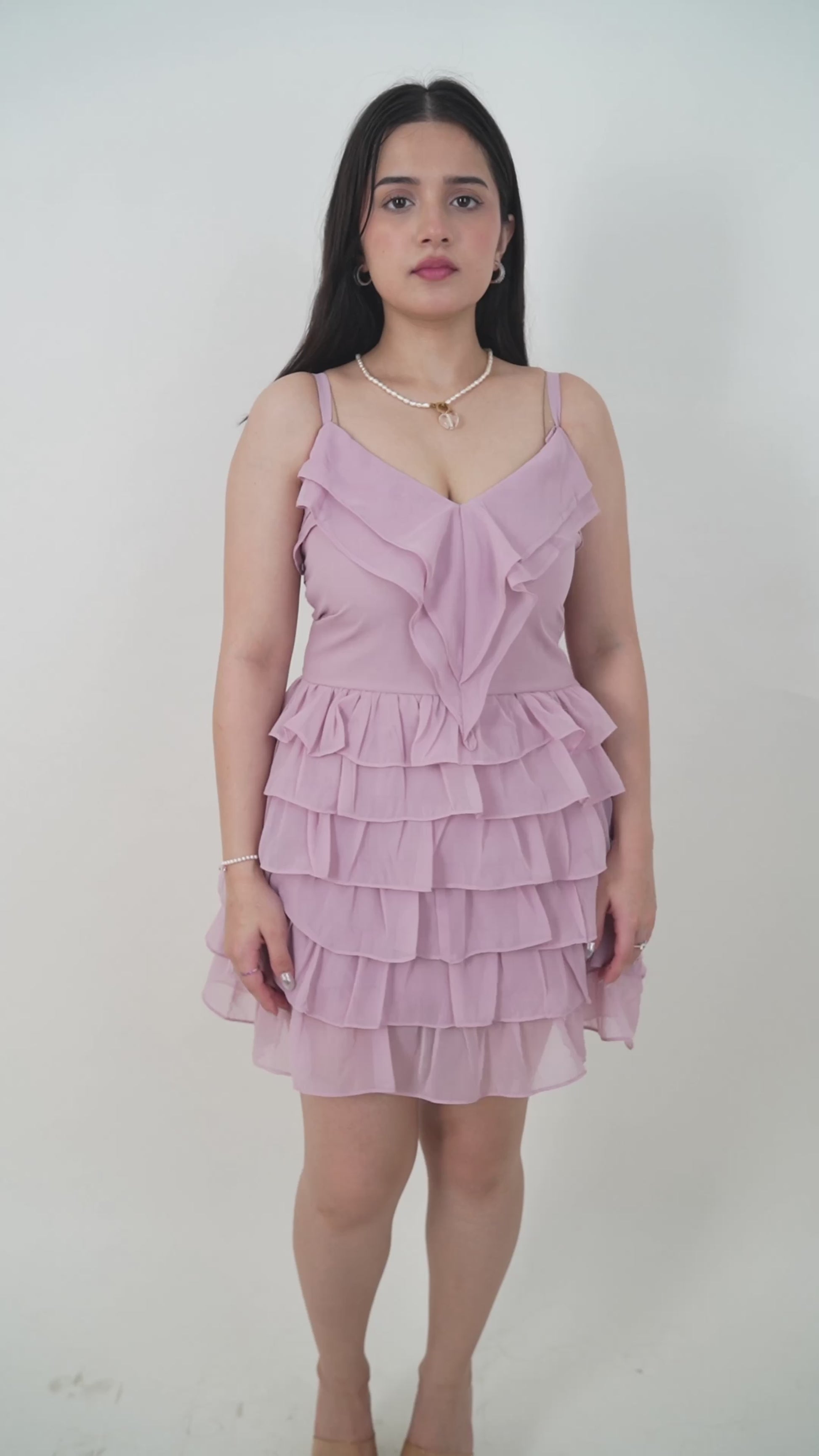 A mauve mini with playful ruffles, perfect for summer soirées, brunch dates, or dancing the night away! Made of georgette fabric | Available in all sizes and seven colors