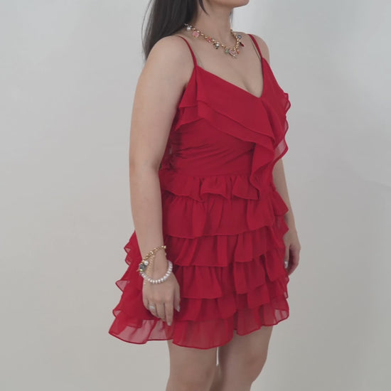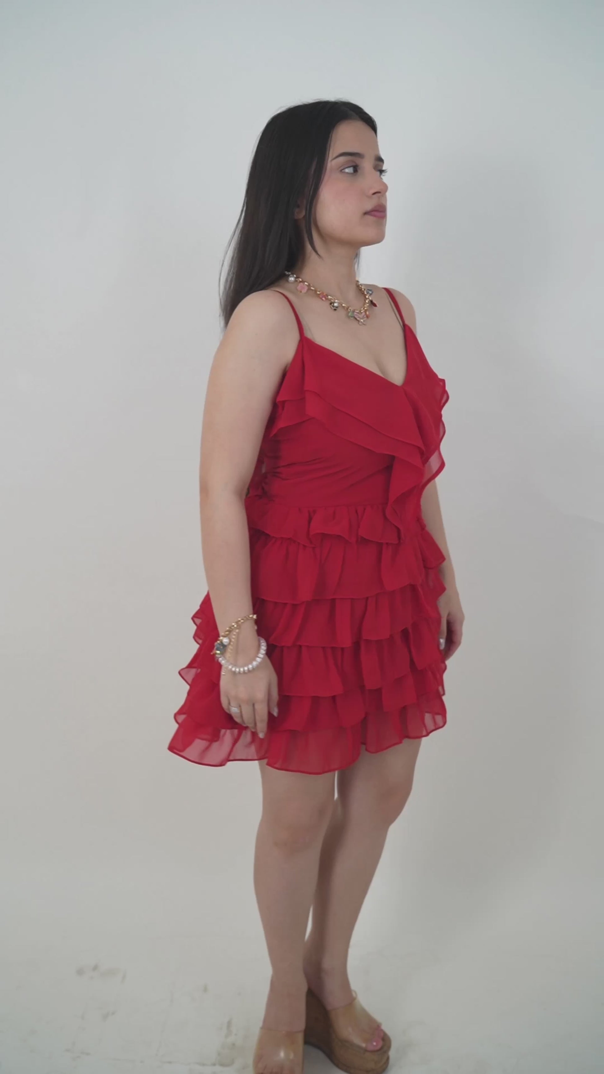 A red mini with playful ruffles, perfect for summer soirées, brunch dates, or dancing the night away! Made of georgette fabric | Available in all sizes and seven colors