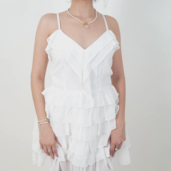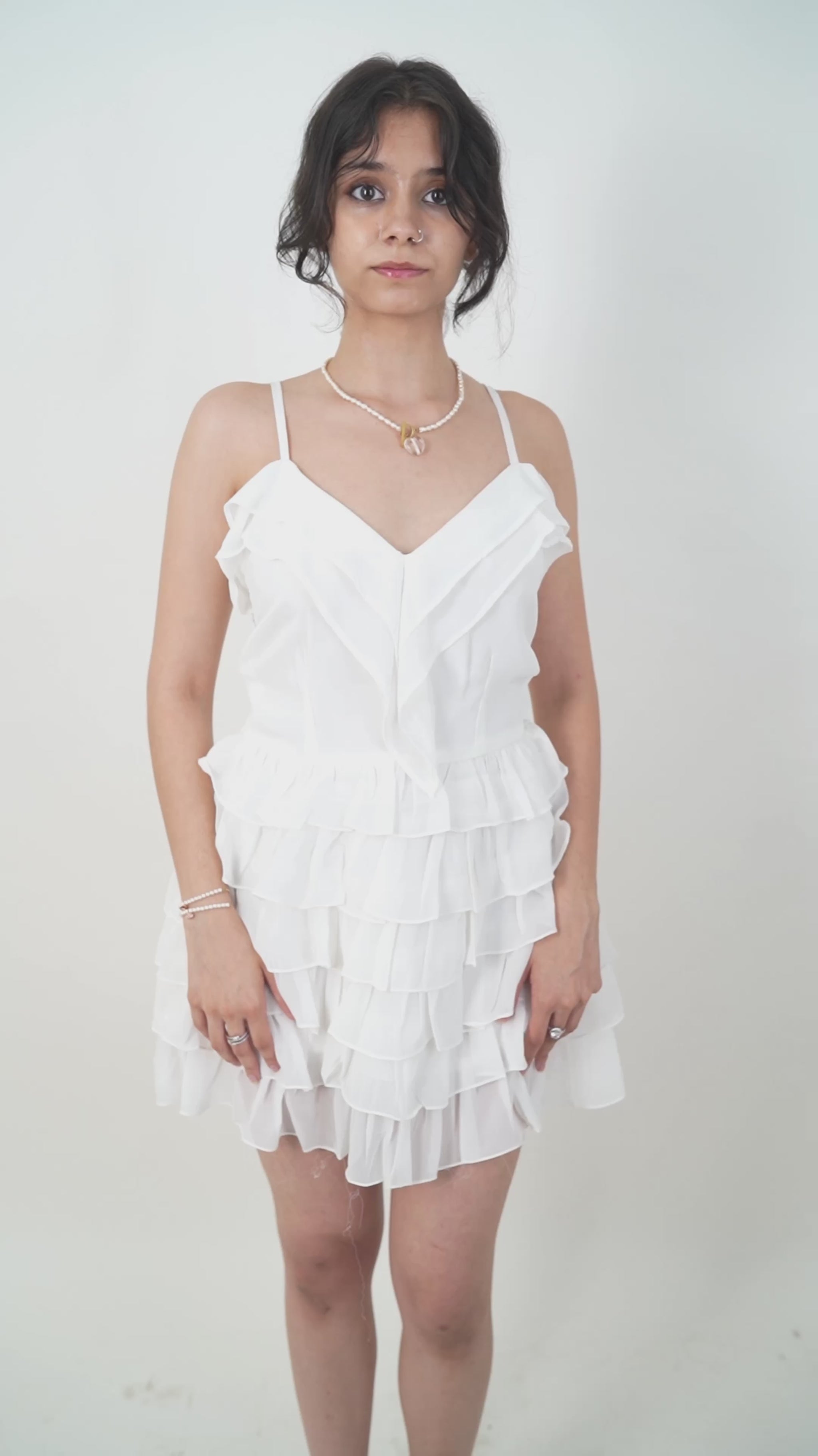A white mini with playful ruffles, perfect for summer soirées, brunch dates, or dancing the night away! Made of georgette fabric | Available in all sizes and seven colors