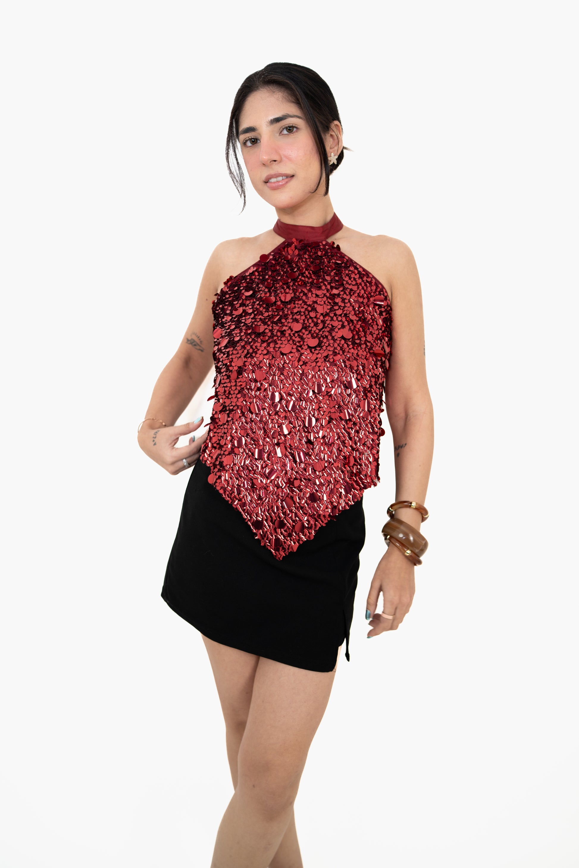 Sunset sparkle, after-hours shine. This is your island-night energy in a red top.
