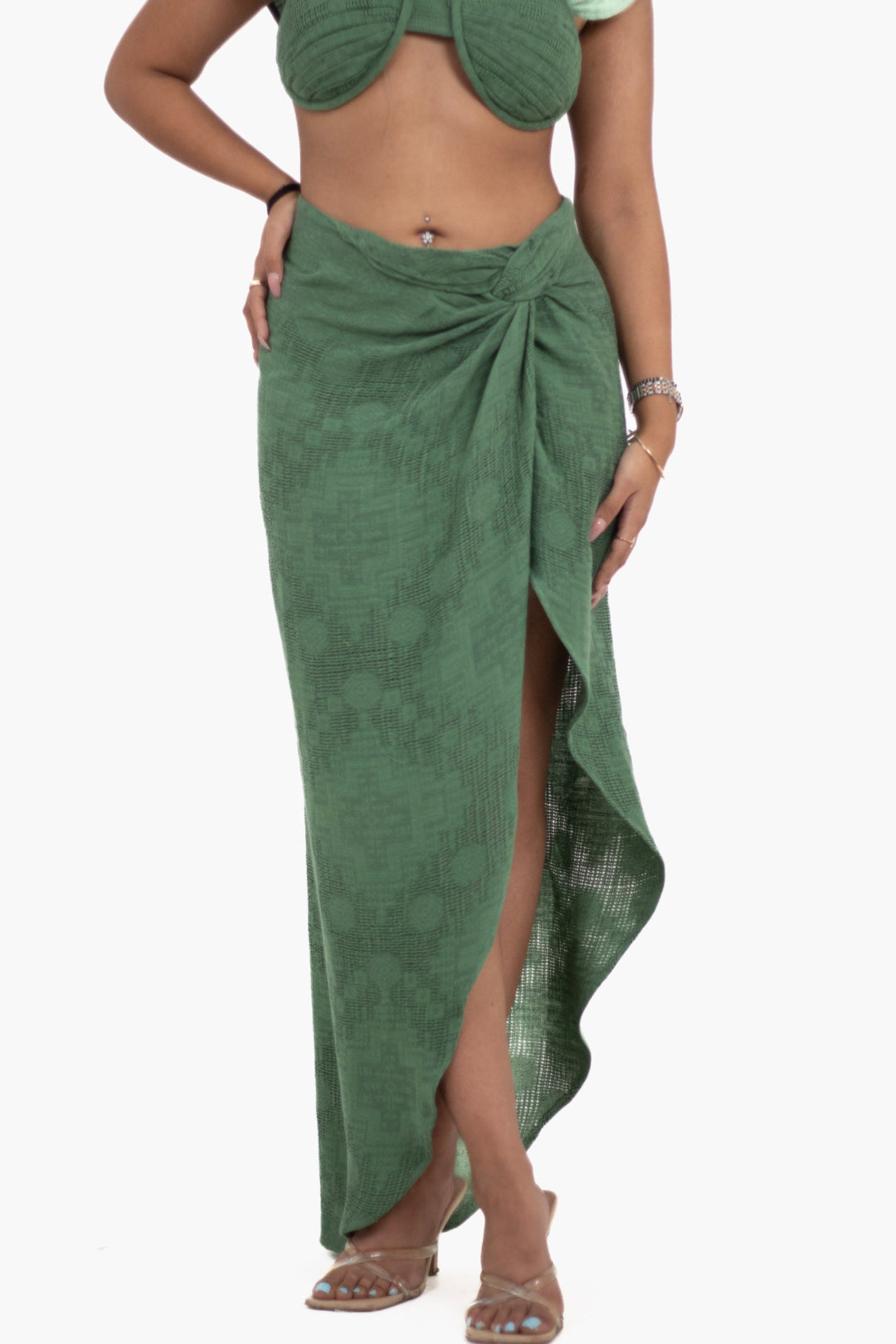 Introducing our enchanting Knitted Draped Skirt, designed to evoke the effortless look of a sarong with a touch of modern elegance. Crafted from delicate knitted fabric in a serene sage green hue, this skirt is a summer vacation essential.