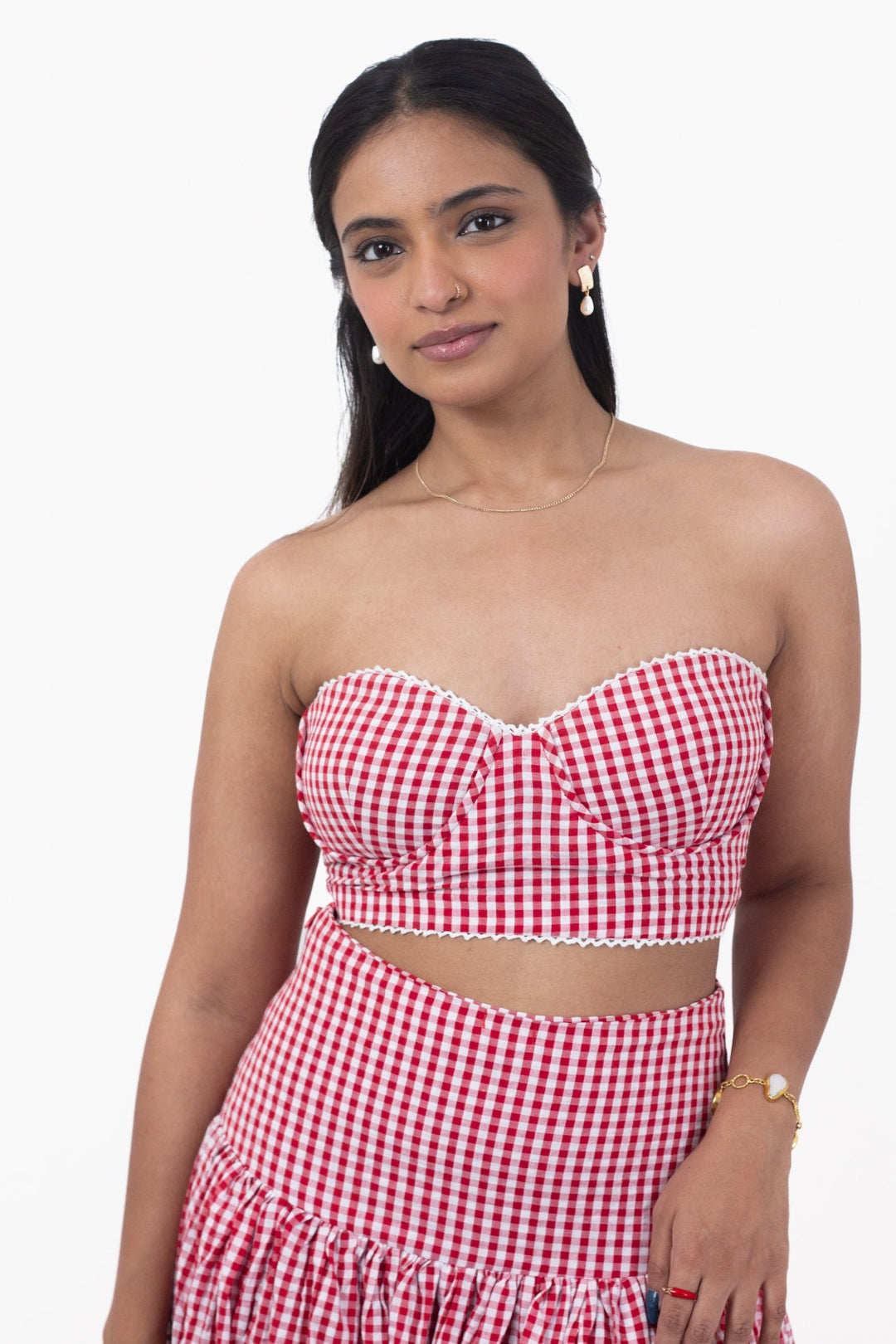 This red & white gingham corset top in cotton fabric is giving us major picnic-date-meets-retro-diva energy! Perfect for summer days, brunch outings, or even layering with a chic jacket for that effortless cool-girl look.